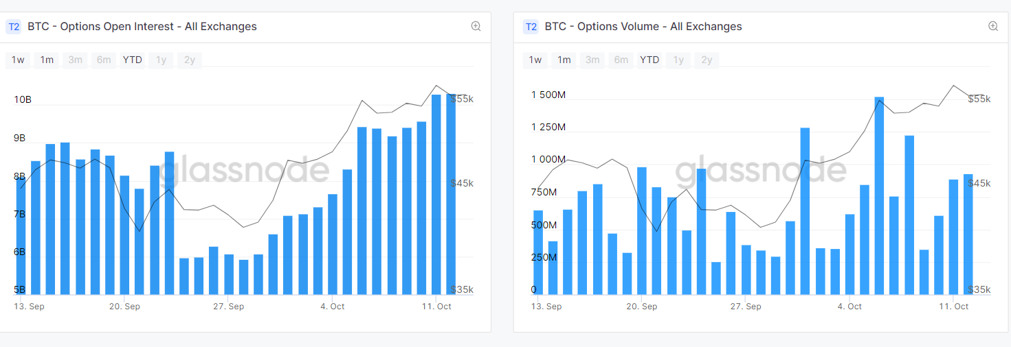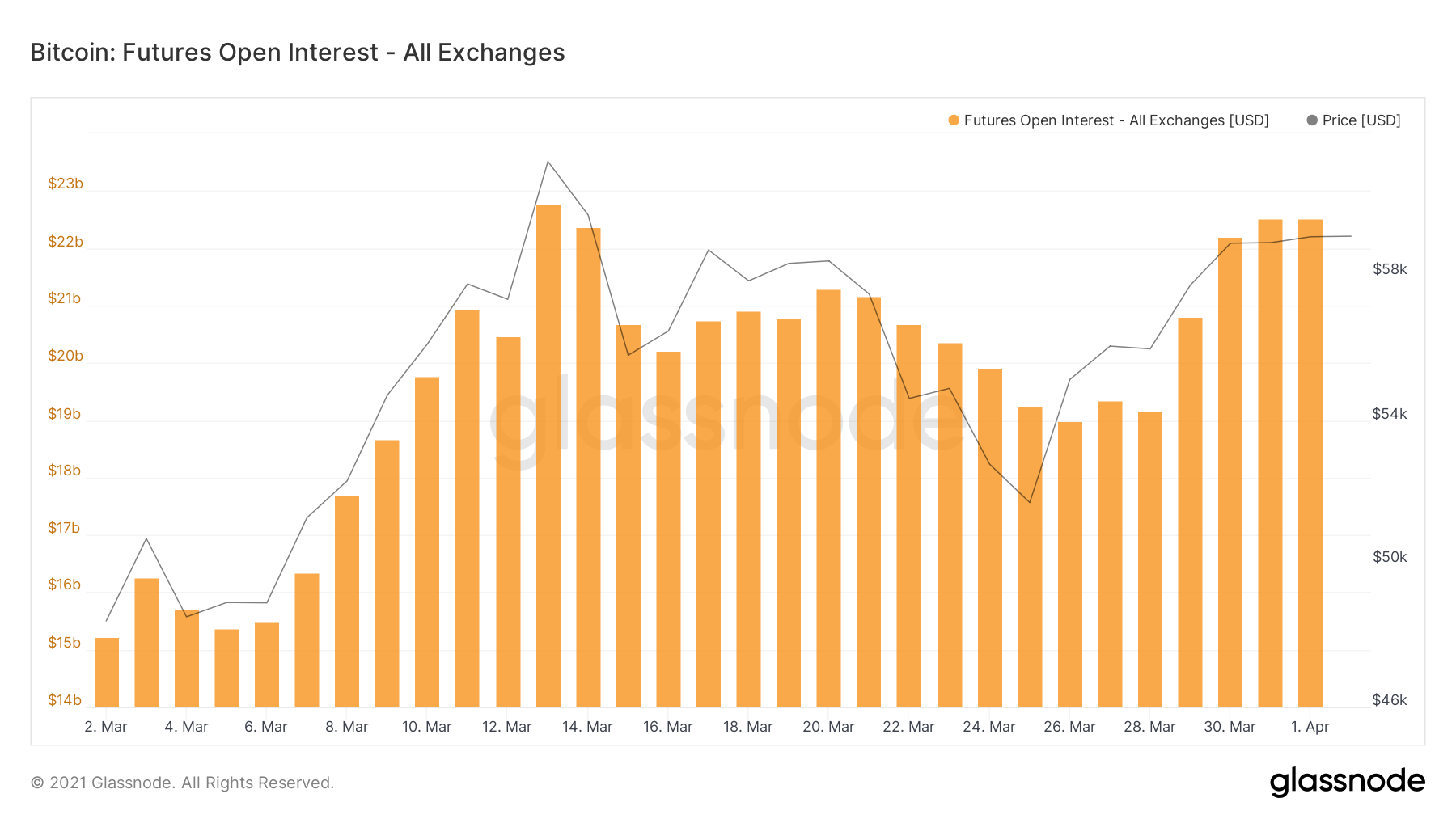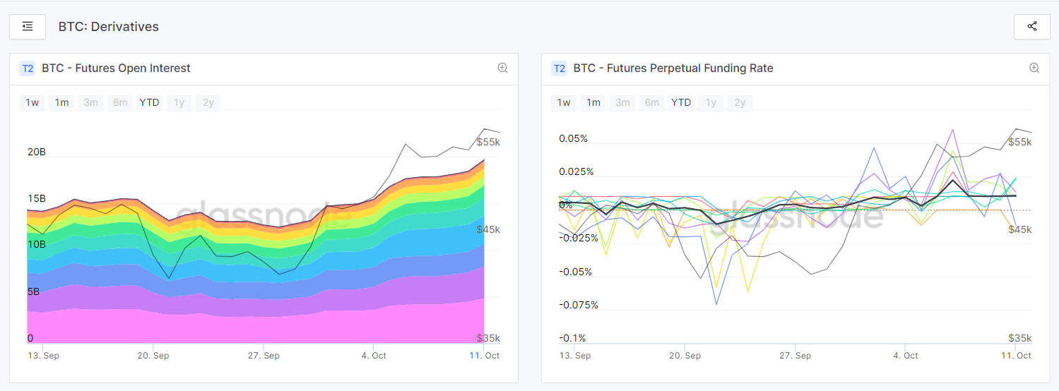 Derivatives traders are more active again, with open interest in bitcoin (BTC) futures going up significantly in recent days as BTC is testing the USD 57,000 level for the first time since May.