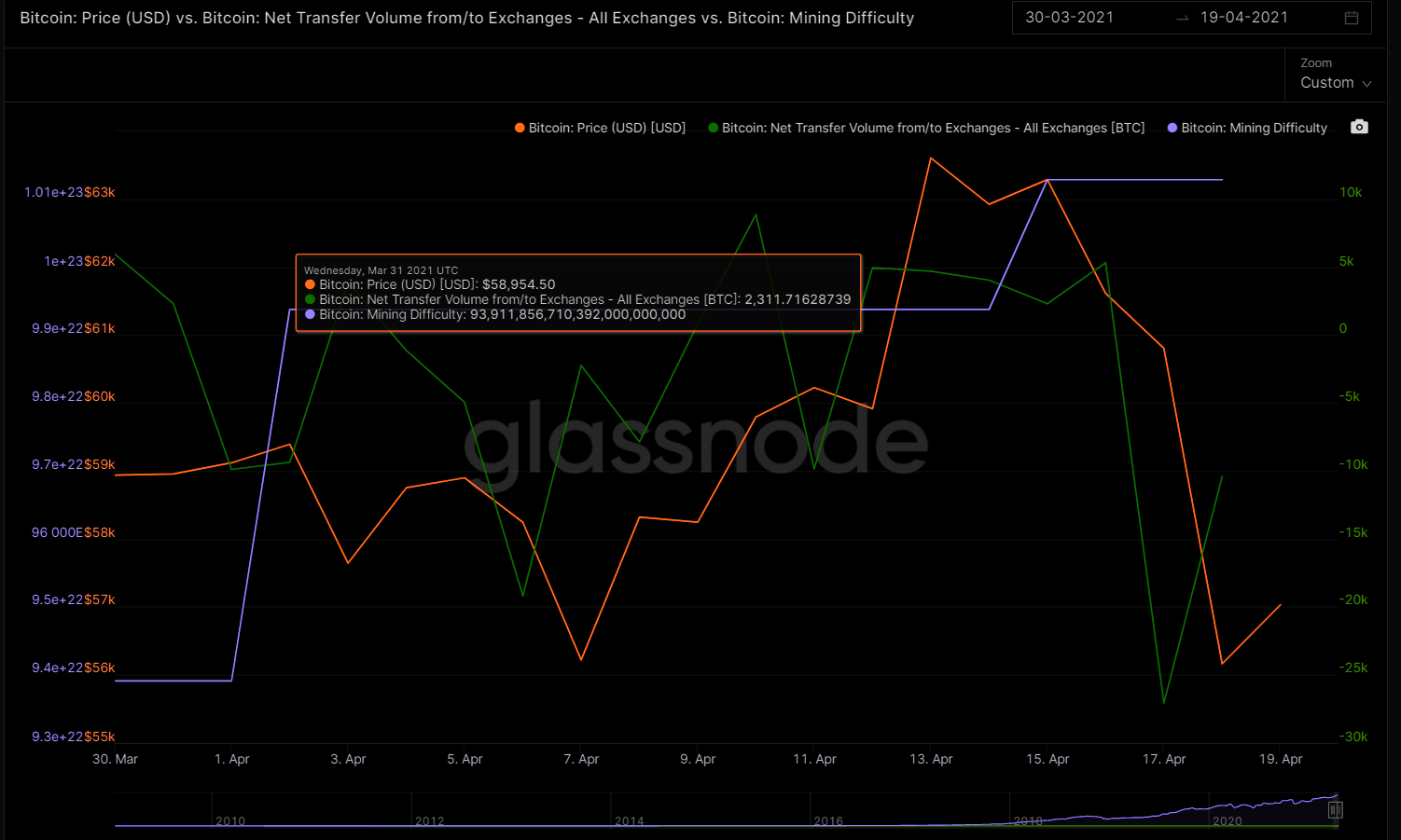 This visualisation of network mining difficulty speaks to the impact of mining on Bitcoin's price. As new coins are mined into existence, miners sell some of their mined coins to pay for production costs. This produces bearish price pressure.