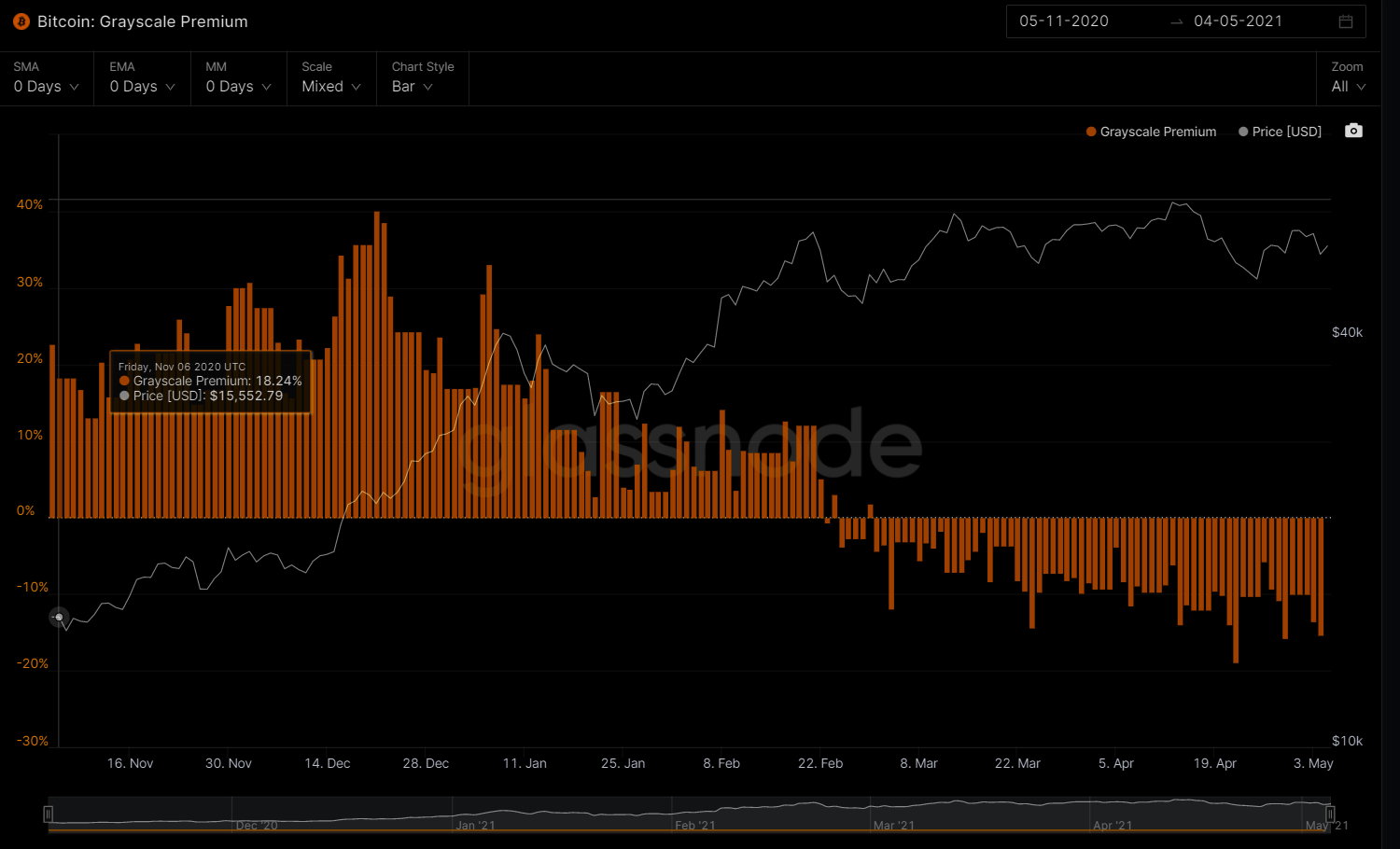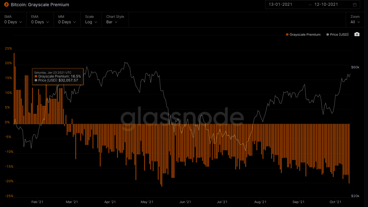This procedure for investors within GBTC was profitable as long the Grayscale indicator was premium. But Grayscale premium indicator has been negative for the most part of 2021 since February.