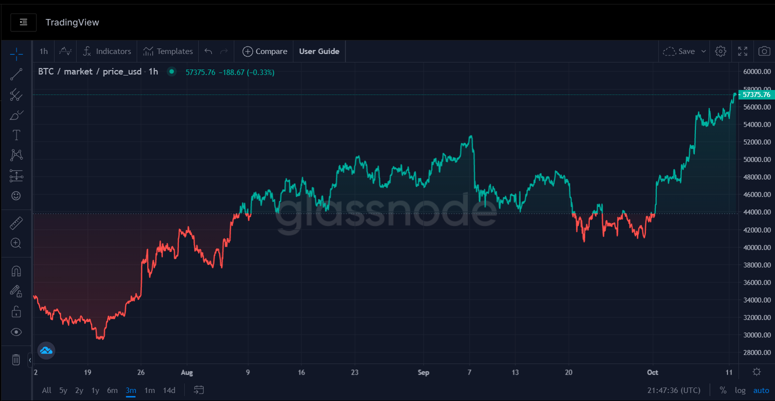 From there, it started a strong bullish signal in the Bitcoin price. Reaching on July an ATH of 41,965 USD. Starting the month of August it decreased to a new resistance level of 37,485 USD. From that level and almost to the end of the month on August 23th BTC reached a new all time high of 50,103 USD. In the month of September it reached a new ATH price of 52,665 USD.
