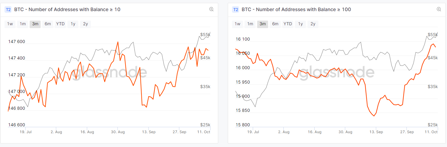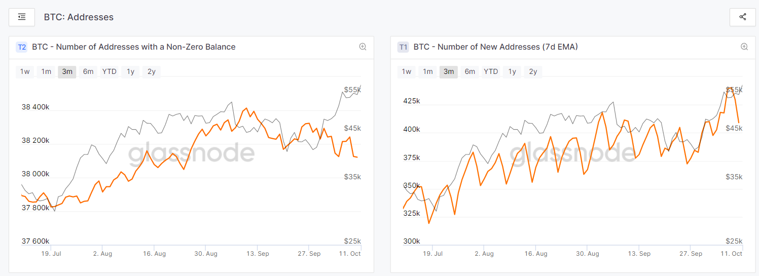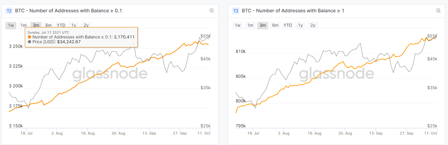 Over the last quarter the number of addresses holding a positive (non-zero) amount of coins have been increasing the whole 3rd quarter of the year. Only in September we saw a slight decline going from 38.4 MM addresses to 38.1 MM Addresses holding a positive balance. Despite that slight decline, it is still a bullish curve and an organic growth on the amount of Bitcoin Wallets. On the other hand the number of new Bitcoin (BTC) addresses created, increased during July, August and September from 342,000 new addresses to 399,000 addresses. The creation of new wallets clearly denotes the continuing global adoption of crypto and more users acquiring coins and getting started with the technology.