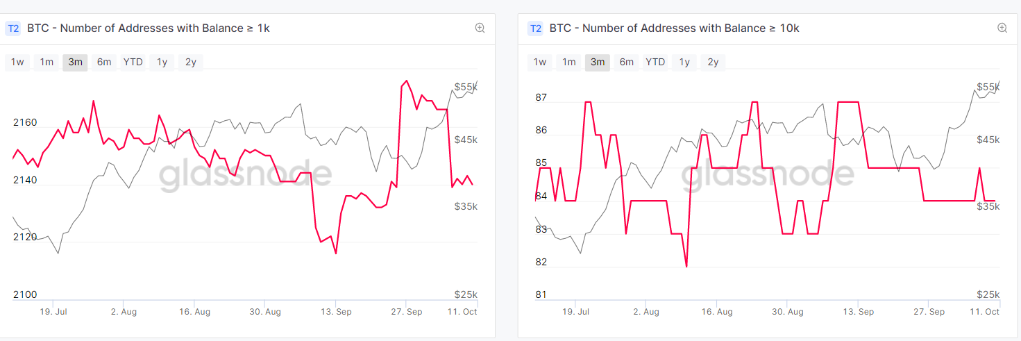 We can note that BTC addresses with balance higher of 10 BTC and 100 BTC have been increasing during the last month of September, which indicates and support the bullish trend. Also BTC wallets higher of 1K increased during the month of September from 2129 wallets to 2160. Wallets with balance higher of 10K BTC have been keeping a stable balance around 84 Bitcoin wallets.