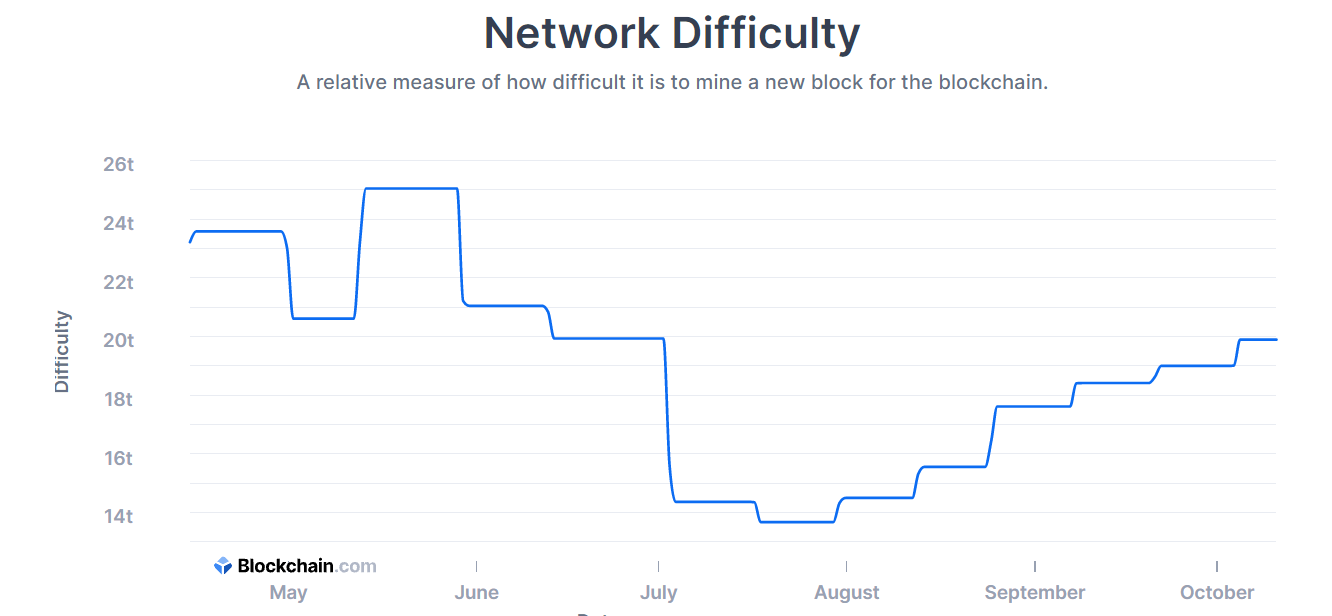 From last quarter it went up from 89 EH/s up to 180 EH/s. Backing up the strong bullish signal bitcoin price have had. Same case for the Bitcoin Mining Difficulty increasing from 14 trillion up to 19.009 trillion in October. Which also represents more compute power and more security in the network. The complexity is adjusted every 2016 blocks , which are roughly 2 weeks, meaning that the time between blocks continues to be every 10 minutes.
