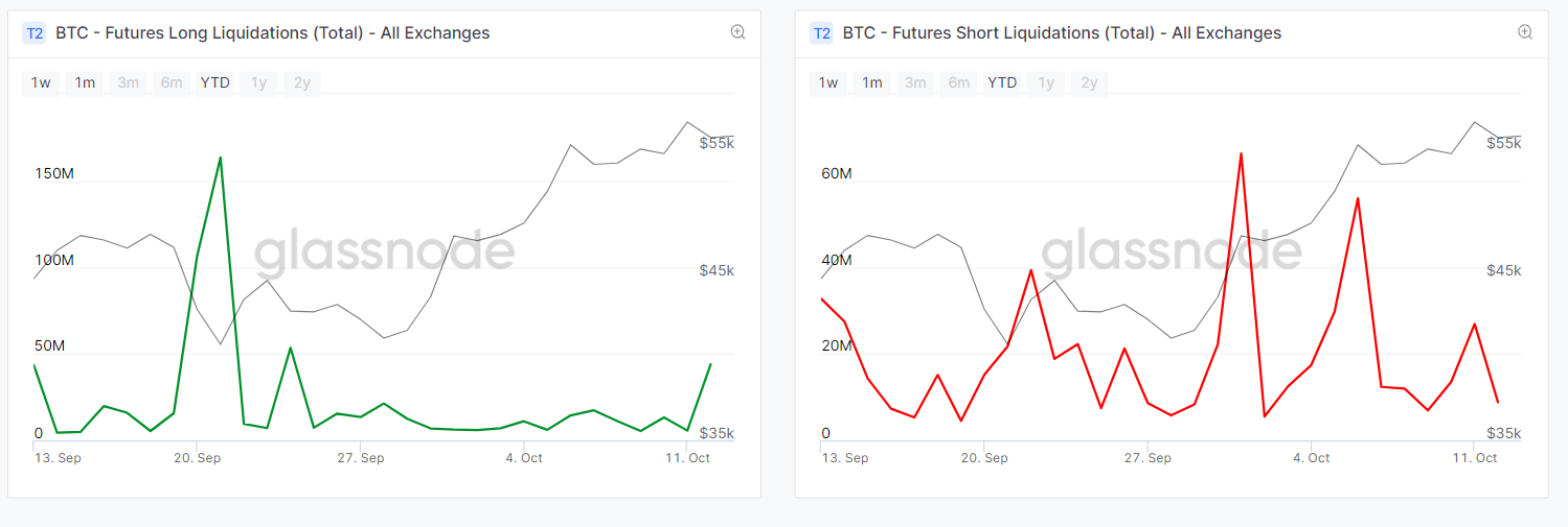 Same case ocurred with the short liquidations when in October 1st there were a total of 66 MM USD accross Binance (16MM USD) , BITMEX ( 34MM USD) and OKEX (15MM USD) respectively. And on October 6th with a total of 55MM USD with Binance with 17MM USD , BITMEX (10MM USD) and OKEX with 27MM USD.