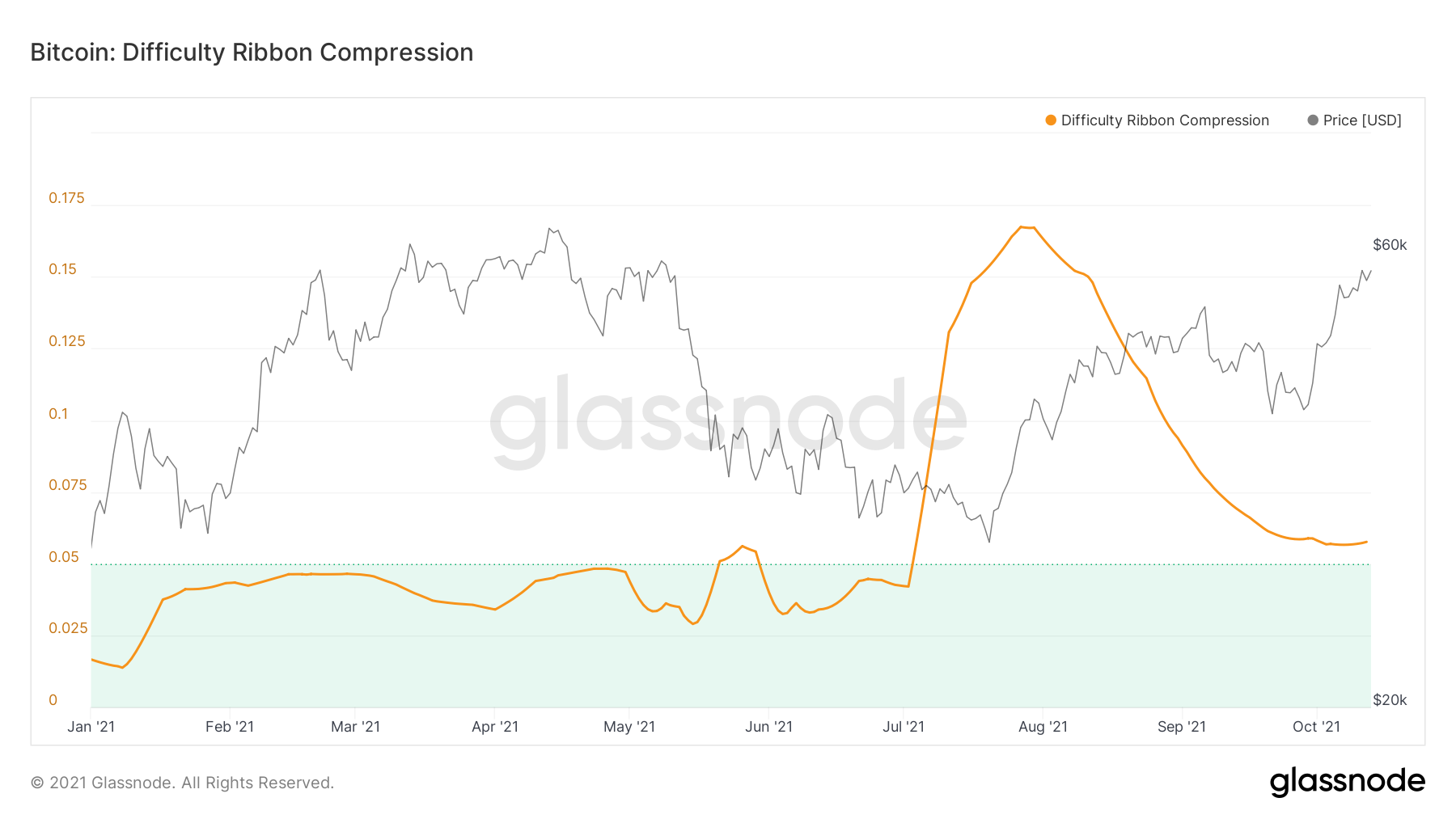 When the ribbon compresses, or flips negative, these are the best times to buy Bitcoin. The ribbon consists of simple moving averages on mining difficulty so we can easily see the rate of change in difficulty.