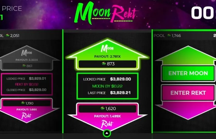 Their main game, MoonRekt, faces players to predict whether a certain token will go up or down in a set period of time (5 minutes, 15 minutes, 1 hour, etc.). All the entry fees are pooled and split among all the players on the winning side in a pro-rata manner (the most a player represents of their side’s pool, the more they will earn if their side wins). A simple, yet effective way to keep players engaged in short, low-risk games that may offer big rewards if more people are participating. They are currently working in a second game, called MuhBags, but no details have been given.
