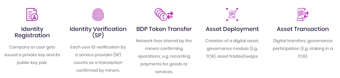 The identity-related transactions are kept on track by miners, which also solve the proof-of-work problems to maintain the consistency of data. As a reward, the miners are granted amounts of BDPp coins, which they can exchange to BDP Tokens to trade within the Ethereum mainnet.