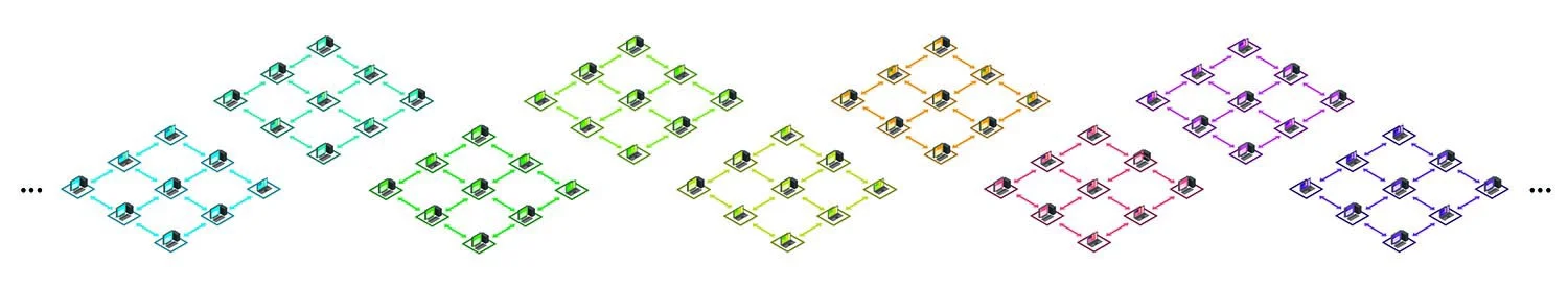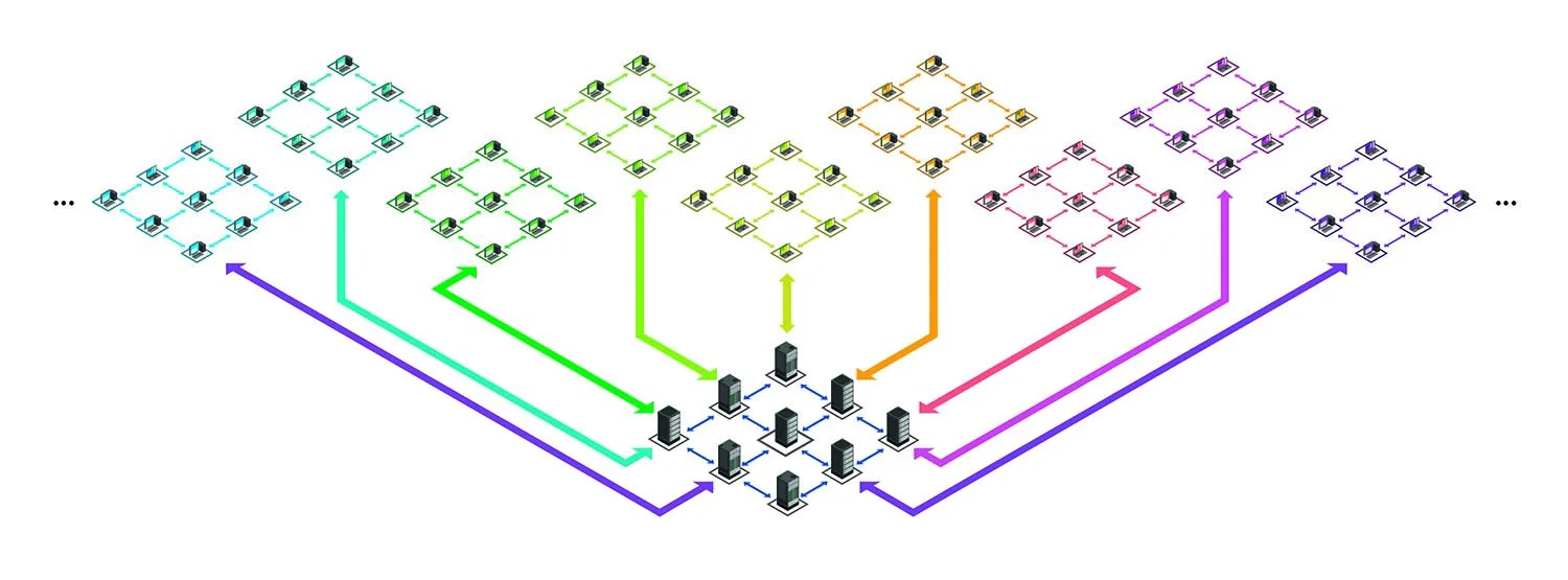 Scalability issues are simply solved by adding more and more shards to the blockchain (above), while the T1 network keeps growing to connect the shards together (below). Image from Tom Anderson.