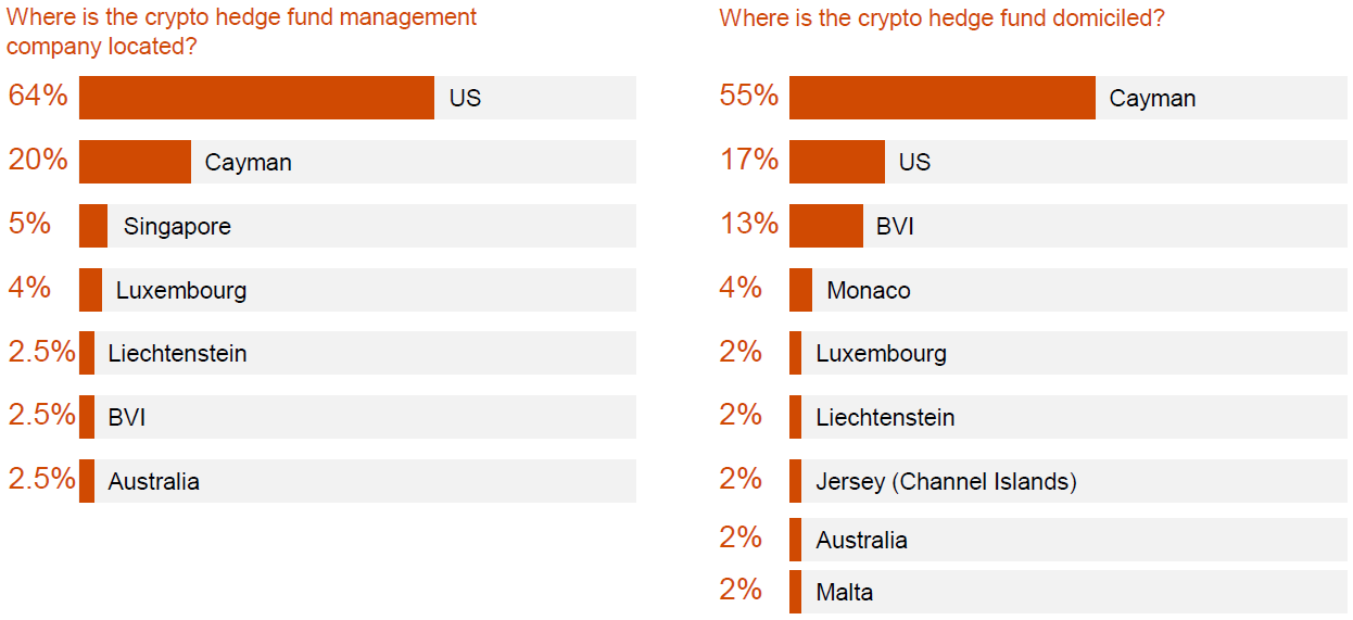 When looking at the legal and regulatory aspects, the location of the company’s offices and the domicile of the fund are very relevant, as they are useful to determine which countries give the most liberties for the management of such funds. 64% of companies are managed from the US, while 55% of funds are domiciled in the Cayman Islands, much like traditional hedge funds. They then advice that customers should be aware of this information, as some may not agree with that sorts of practices, even when domiciling the fund in a different location might be beneficial in terms of legal repercussions.