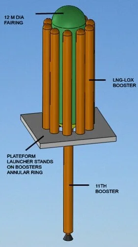 The first half of the project is the design and creation of a new model of lunar launcher: A 4-phase ship with a total of 11 boosters (10 boosters surround the main cargo compartment and a last one is attached to the bottom, which would sit underground during launch). Achieving a thrust of 6000 tons at launch, it is calculated to reach payload masses of 240 tons for LEO and 66 tons to the Moon. Along with this, the schematics also include plans for standardized compartments to hold the cargo, and the use of pre-compressed airbags to avoid movement and damage, which makes the shipping an extremely secure process.
