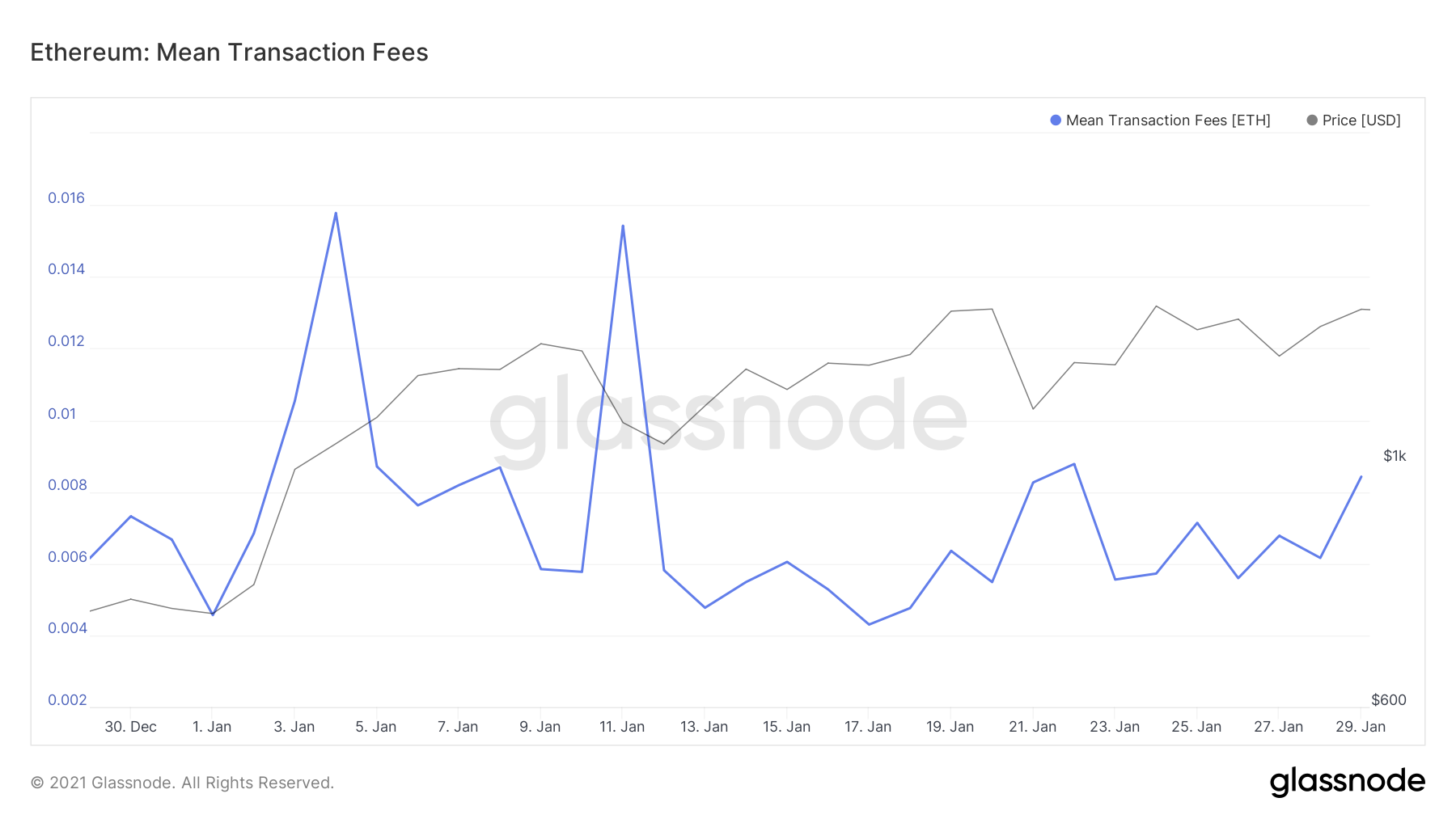 The amount of new addresses created daily across the last months shows a massive increase in the recent days, most likely motivated by all the relevant movements driving more people to enter the market. However, the mining aspect seems to be unaffected, as the regular “cycles” seem to be constantly repeating, while transaction fees seem to have returned to their normal state after the big spikes of January 4th and 11th (correlated to the increase in transaction volume seen those days).