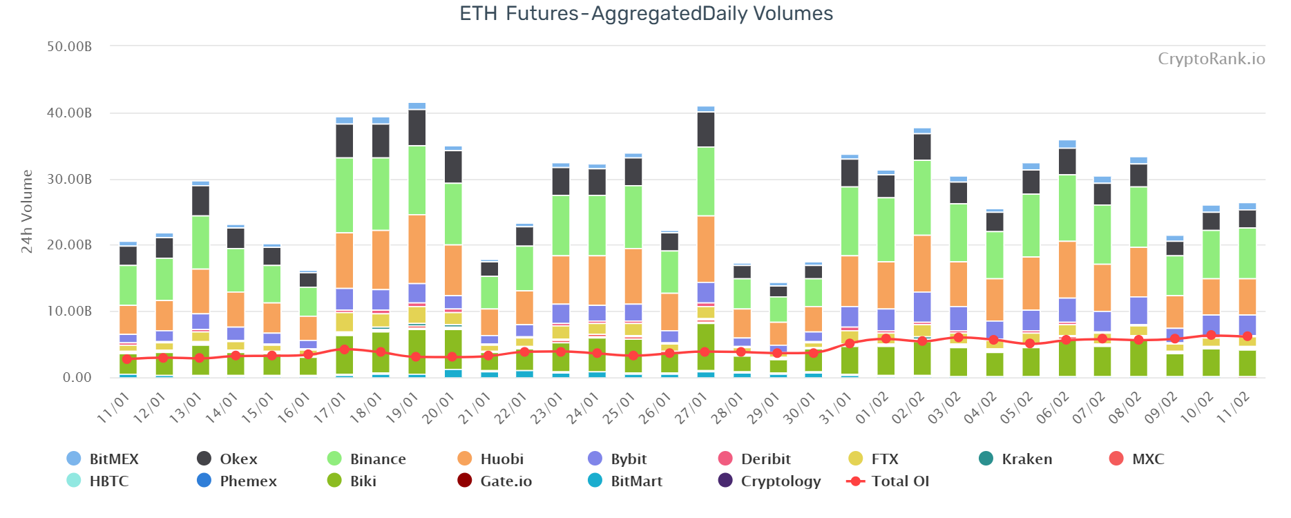 The futures market is seeing these effects as well, with trading volumes maintaining the high average of last week while open interest is still on the rise. Similarly to BTC, these behaviors are indicators of strong trends continuing and painting a positive picture for the near future.