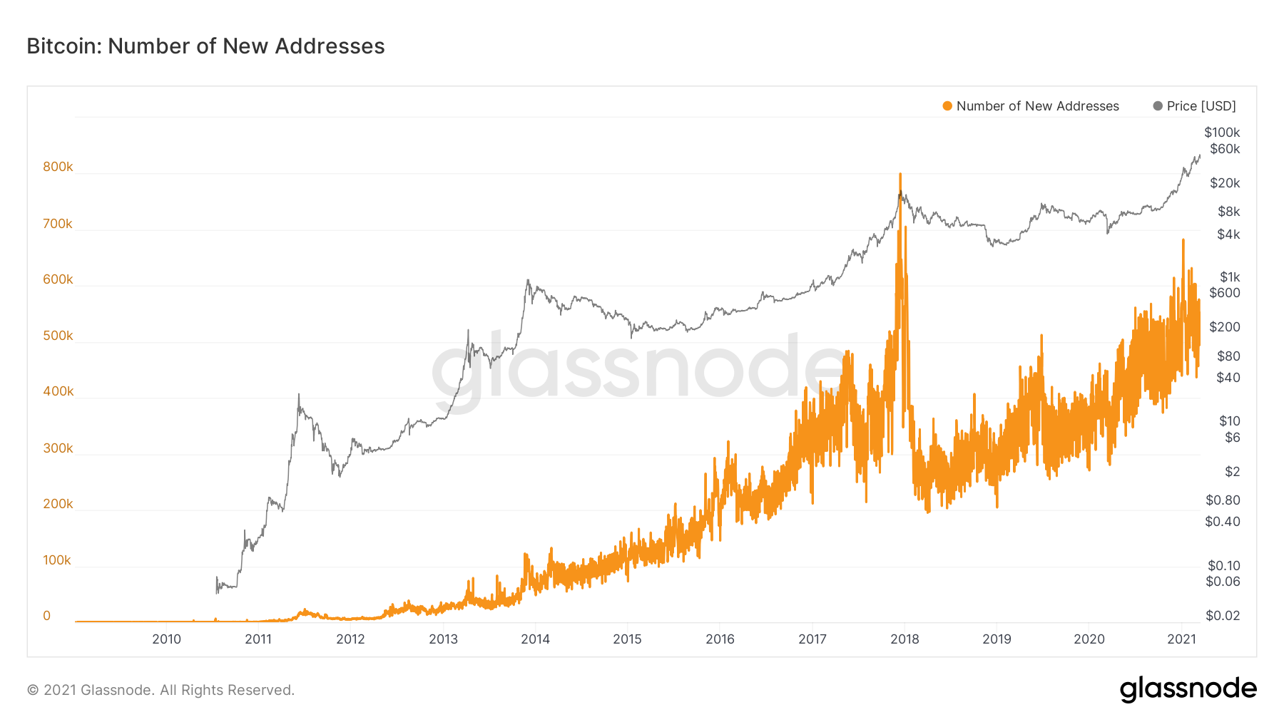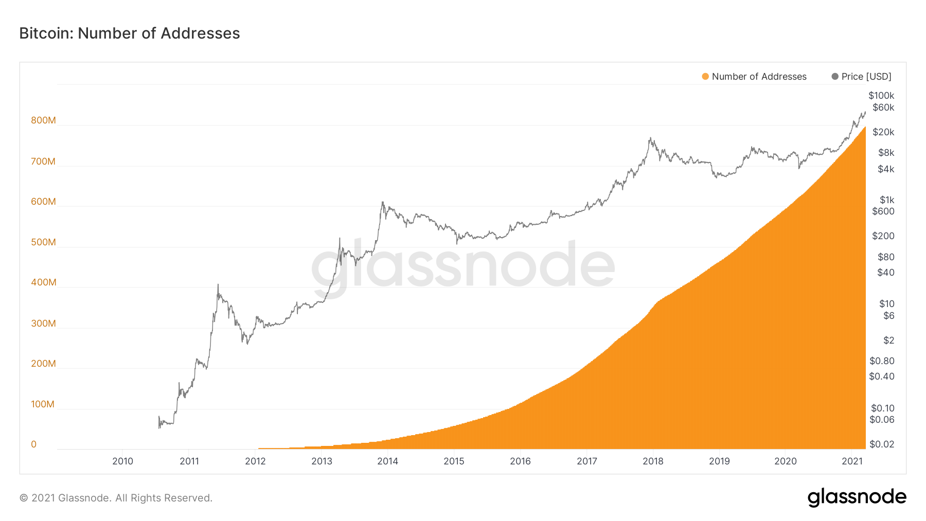 The trend continue to be bullish but it is also worth noting how both in the correction of Bitcoin (BTC) during December 2017 and January 2018 decreased the new addresses indicator similar to this last week of march 2021. Although the trend of total addresses reaches more of 795 MM of Bitcoin Wallets addresses. (See graph on the left)