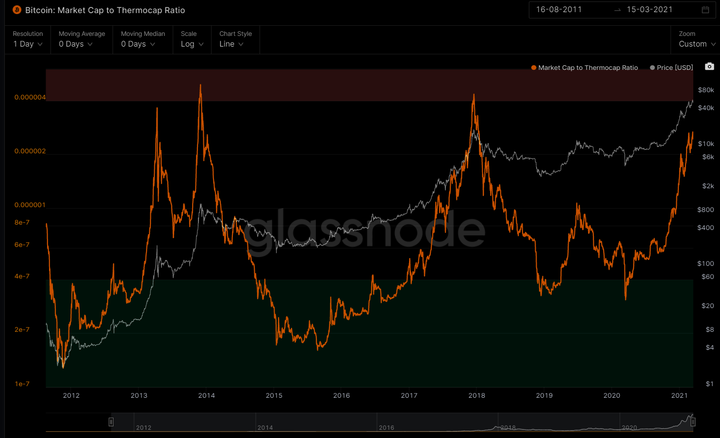 The Market Cap to Thermocap Ratio is simply defined as Market cap / Thermocap, and can be used to assess if the asset's price is currently trading at a premium with respect to total security spend by miners. The ratio is adjusted to account for the increasing circulating supply over time. Which suggest that the gains are only getting started and a top is still far off.