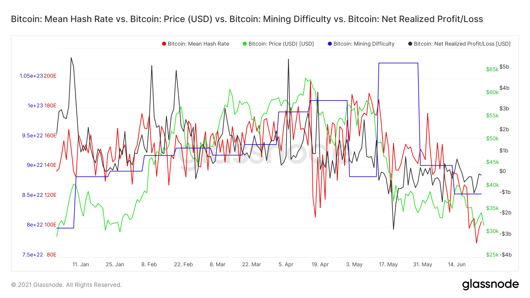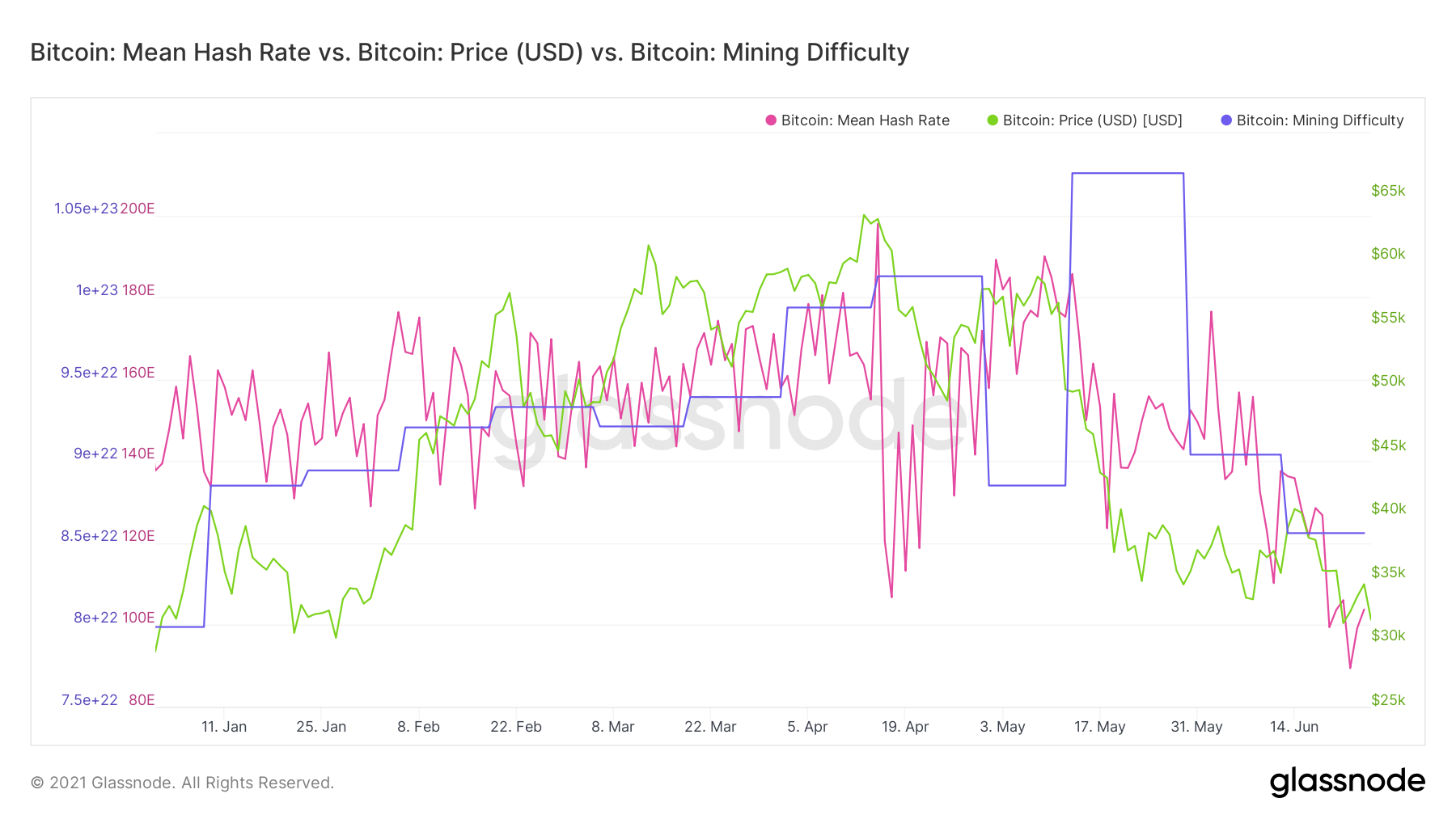 We can see how the Bitcoin mean hash rate has been affected heavily the last few months. Falling from 197 eH/S to 106 eH/s on April due to the black out in China which we covered extensively on our past research here. It did recovered fast going back again on 05/09 to 190 EH/S to start decreasing again to 123 EH/S on 05/18 to 110EH/s on 06/11 to currently being at 85 EH/S. The decrease on the hash rate follows directly the fall on Bitcoin price over the last 6 weeks and the situation currently happening in China.