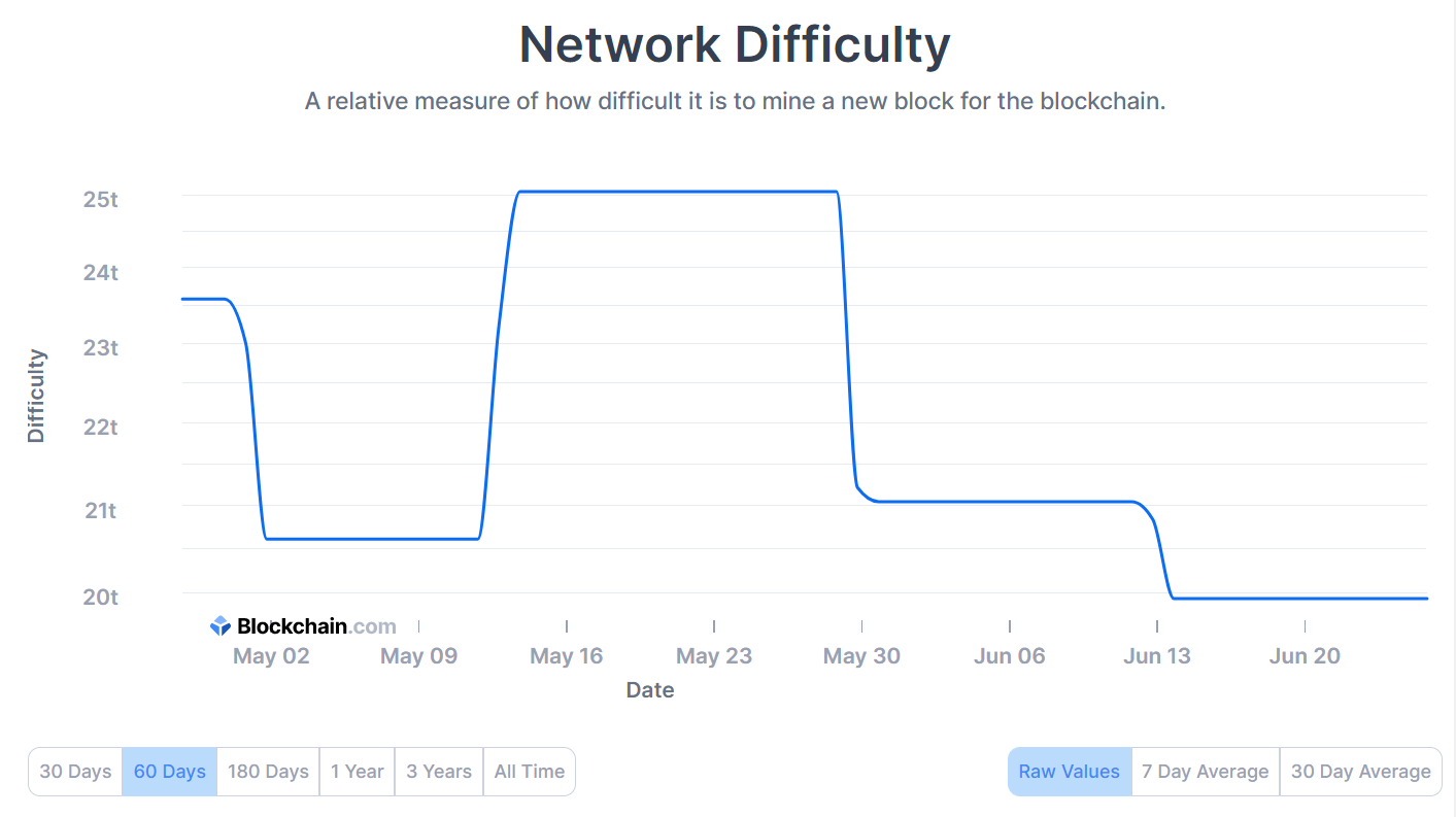 We can also note the fall on the Bitcoin mining difficulty due to the decrease on the hash rate. Falling from 25.046 trillion to 21 trillion at the beggining of June and currently at 19 trillion.