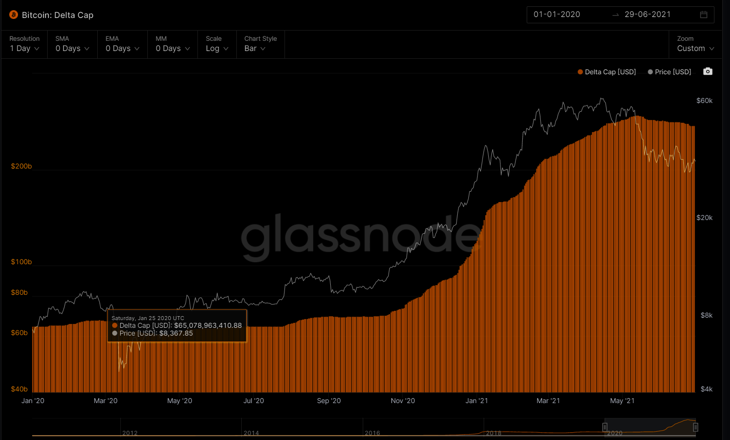 Delta Cap is the difference between Realized Cap and Average Cap, where Average Cap is assumed to be the life-to-date moving average of Market Cap.